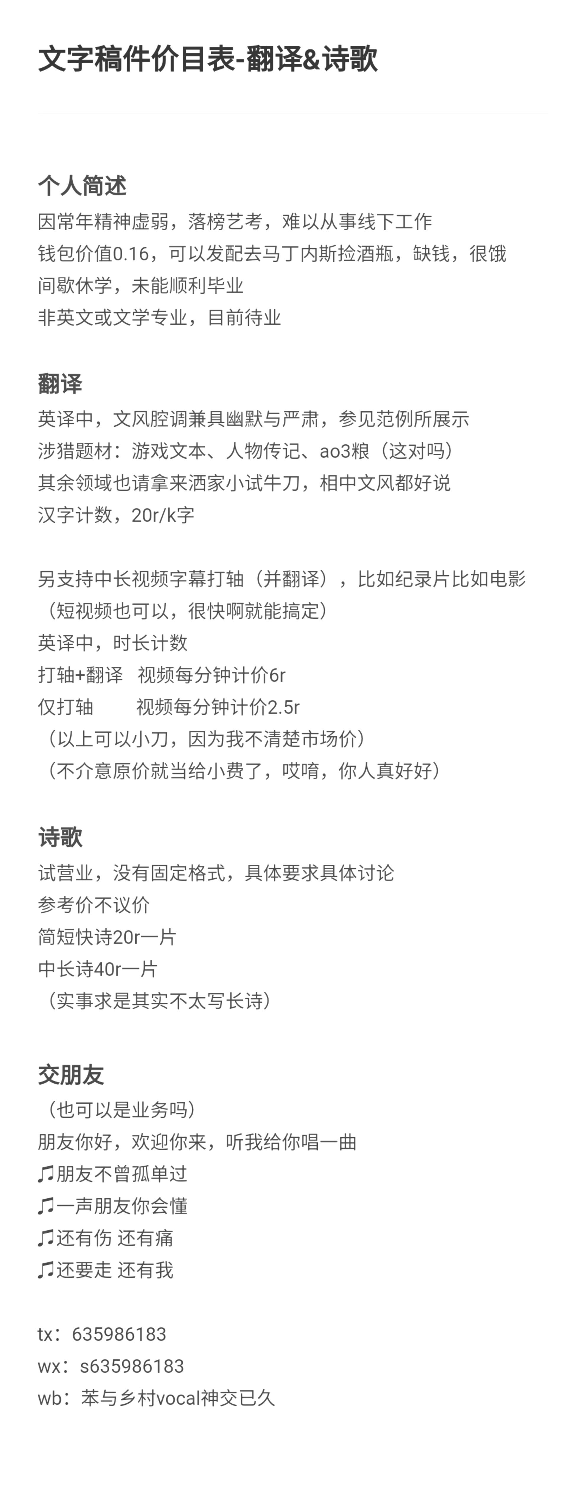 为不玩毛象的朋友代发接稿信息。她因健康原因难以从事线下工作,目前经济拮据,独自在城市中努力维持生计。